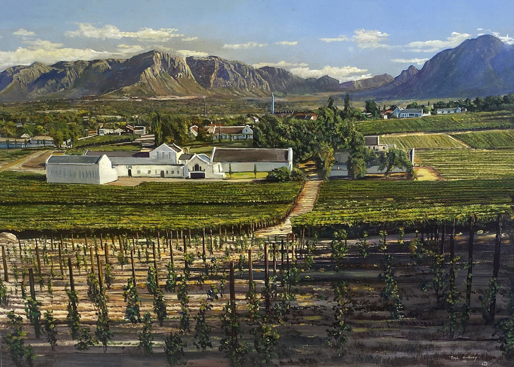 Nestled in the heart of the Paarl wine region, Laborie Wine Estate, part of KWV, stands as a testament to South Africa’s winemaking heritage. This artwork brings to life the estate’s lush vineyards, stretching into the horizon under the watchful gaze of the towering mountain ranges. Errol’s masterful brushwork captures the stunning beauty of the Cape Winelands with a vibrancy that transports you right into the scene.