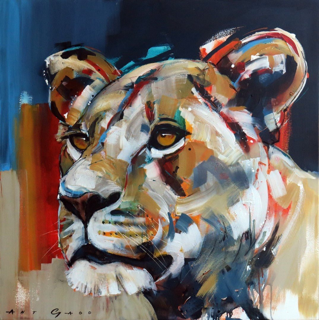 "Majestic Stillness" beautifully captures the strength and quiet majesty of a lioness through a bold, expressive palette. Artist Anthony Gadd skillfully blends realism and abstraction, portraying not just the animal’s form but her essence. Her amber eyes pierce the canvas with calm intensity, radiating wisdom, resilience, and presence.