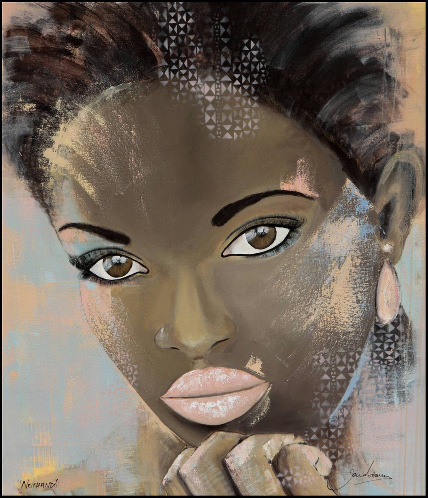 This is a very large original oil on canvas painting by South African artist Jen Adam. The artwork is a beautiful portrait of an African woman and is entitled NOTHANDO, African meaning is "The One Who is Loved".
