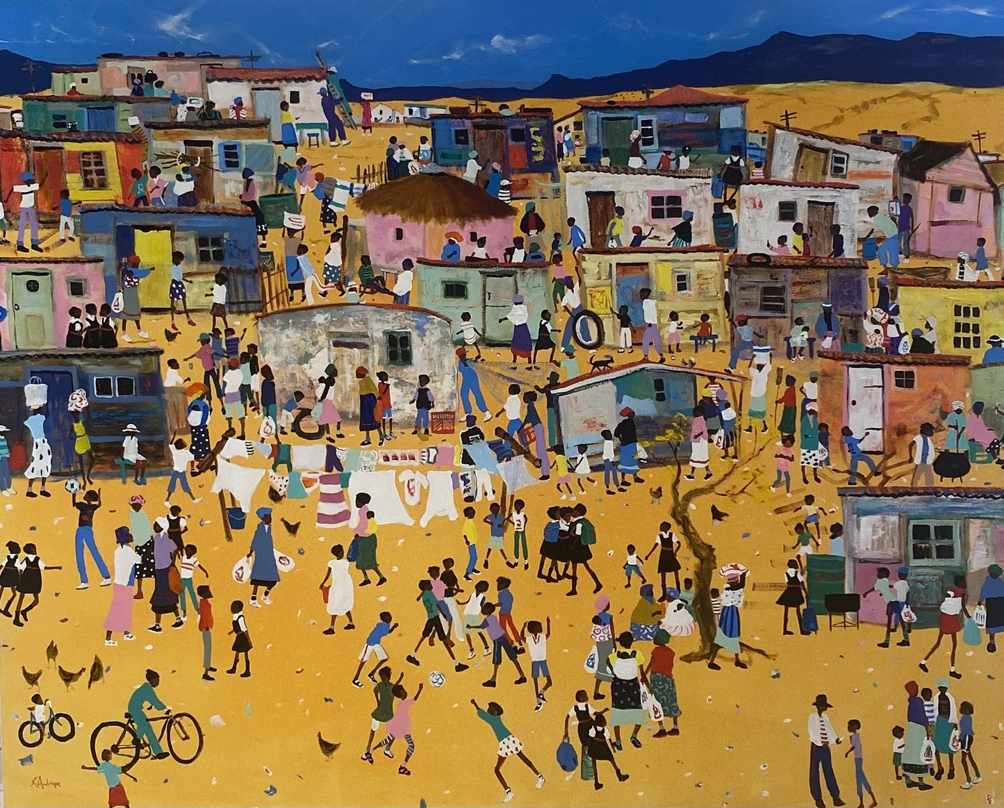 Original hand-painted acrylic on canvas painting by South African artist Katharine Ambrose depicting a typical township scene.